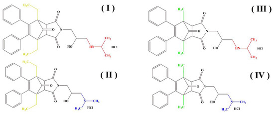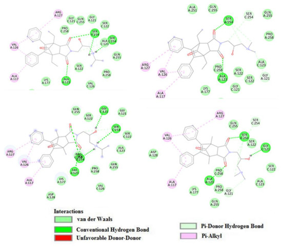 For each of the molecules, there was also present an intramolecular hydrogen bond, which additionally stabilized the potential bioactive conformation. While in the case of ethyl derivatives (compounds I and II) the bond was present between the OH group and the hydrogen of the amino group in the chain, in the case of methyl derivatives (compounds III and IV) the bond was between the OH group and the oxygen carbonyl of the imide group in the ring. Predicted binding interactions with the enzyme are depicted in Figure 6 and Figure 7.