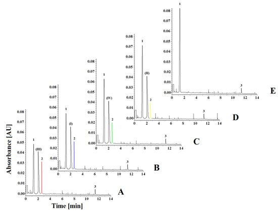 Representative electrophoregrams of investigated compounds in the presence of (I), (II), (III) and (IV) CAT inhibitors at the concentration of 20.00 mM, hydrogen peroxide at the concentration of 10 mM and (1) 20.00 mM of guaiacol (GCOL), (2) tetraguaiacol (TGCOL), (3) catalase (CAT). (A): (1) 11.71 mM of GCOL, (2) 8.29 mM of TGCOL (●) in the presence of inhibitor (III). (B): (1) 14.14 mM of GCOL, (2) 5.86 mM of TGCOL (●) in the presence of inhibitor (I). (C): (1) 15.61 mM of GCOL, (2) 4.39 mM of TGCOL (●) in the presence of inhibitor (IV). (D): (1) 17.56 mM of GCOL, (2) 2.44 mM of TGCOL (●) in the presence of inhibitor (II). (E): (1) 20.00 mM of GCOL, (2) 0.00 mM of TGCOL without inhibitors.