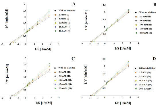 Lineweaver–Burk plots for systems with inhibitors (I) (A), (II) (B), (III) (C) and (IV) (D) at concentrations of 2.50, 5.00, 10.00, 15.00 and 20.00 mM.