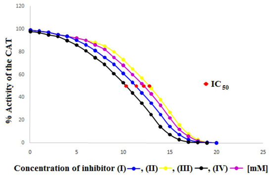 Comparing the obtained IC50 values for compounds (I) (IC50 = 11.40 mM), (II) (IC50 = 12.80 mM), (III) (IC50 = 10.30 mM) and (IV) (IC50 = 12.20 mM), it can be clearly seen that compound (III) lowers the CAT activity by 50% at the lowest concentration of all four inhibitors. This means that compound (III) is the most potent CAT inhibitor, which is in line with all previously obtained kinetic parameter values. The IC50 values for all four compounds increase in sequence (III) (IC50 = 10.30 mM), (I) (IC50 = 11.40 mM), (IV) (IC50 = 12.20 mM), (II) (IC50 = 12.80 mM), again confirming that compound (III) is the most potent CAT inhibitor while compound (II) is the weakest CAT inhibitor.