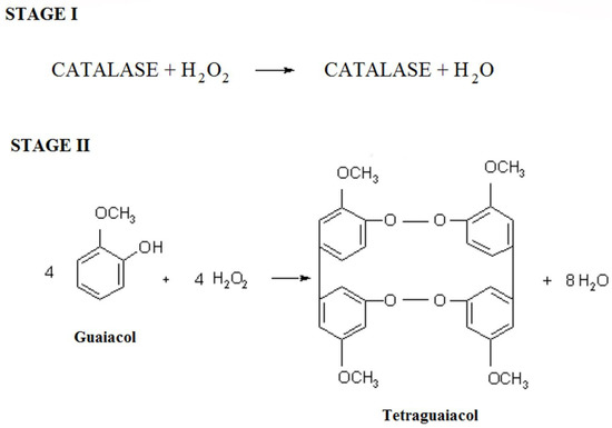 Free hydrogen peroxide (stage 1), which has not been completely degraded by the enzyme by the action of inhibitors, reacts then with GCOL to form a specific amount of TGCOL (stage 2), the concentration of which depends on the CAT activity (Figure 8).