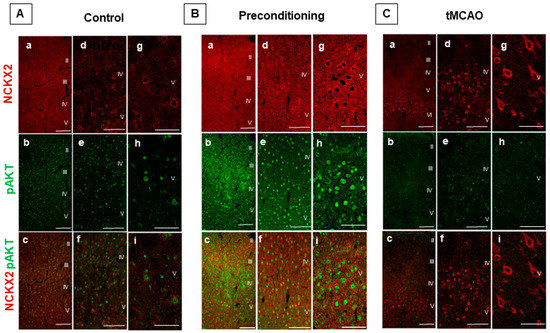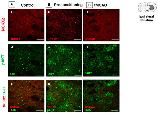 CO-EXPRESSION OF NCKX2 AND pAKT IMMUNOREACTIVITIES IN THE STRIATUM OF PRECONDITIONED AND ISCHEMIC RATS. Representative images (g–i) displaying the co-expression of NCKX2 (a–c) with pAKT (d–f) immunoreactivities in the striatum of control (A), preconditioned (B) and ischemic animals (C). Scale bars 50 μm.
