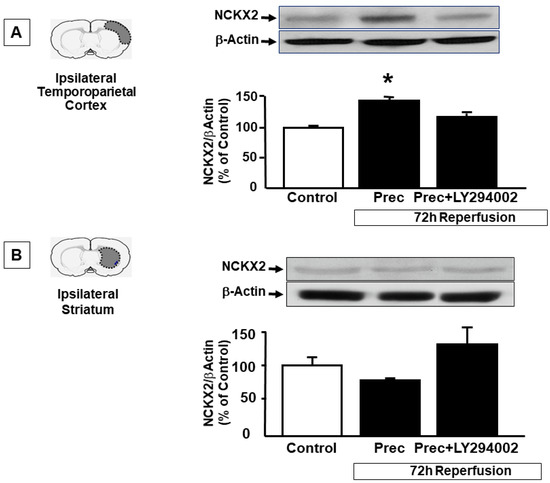 To further support the tight interaction between NCKX2 and p-AKT, the p-AKT inhibitor LY294002 was icv injected before preconditioning induction and NCKX2 expression was evaluated in the ipsilesional temporoparietal cortex and in the striatum of rats exposed to ischemic preconditioning at 72 h of reperfusion and compared to the expression of the protein in the same brain regions of vehicle-treated rats. In accordance with our results from double immunofluorescence experiments, showing a co-expression of NCX2 and pAKT in this brain region, the increase in NCKX2 protein expression induced by preconditioning in the temporoparietal cortex was prevented by the p-AKT inhibitor LY294002 (143 ± 8 vs. 117 ± 5.5, respectively) (Figure 4A), thus suggesting that NCKX2 overexpression induced by preconditioning in the cortex may occur through a p-AKT-mediated translational activation. By contrast, as expected, in the striatum, the use of LY294002 did not modify NCKX2 expression (Figure 4B), thus supporting the hypothesis that in this area and in these experimental conditions, NCKX2 synthesis did not increase, but rather it prevented its degradation promoted by the lethal ischemic insult. This result was in line with immunofluorescence experiments showing that after preconditioning, pAKT did not colocalize with NCKX2 in the striatum (Figure 3).