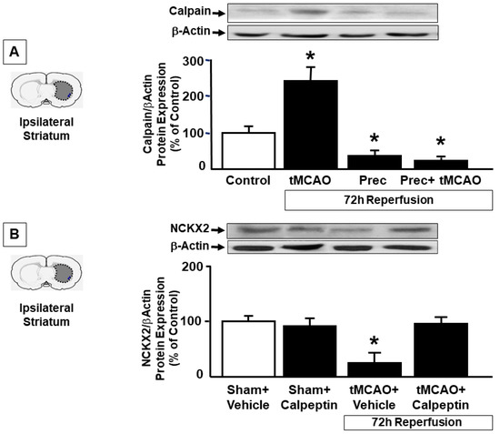 2.3. Preconditioning Prevents Calpain Activation Responsible for NCKX2 Downregulation in the Striatum of Ischemic Rats