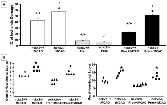 In order to assess whether the changes observed in NCKX2 expression had a pathophysiological meaning, nckx2+/+ and nckx2−/− mice were subjected to tMCAO, or to preconditioning plus tMCAO and the infarct volume was evaluated 24 h after surgery. Our results showed that NCKX2 knocking-out was able to induce a loss of the neuroprotective effect induced by preconditioning (% infarct volume: 42.3 ± 6.6 in nckx2+/+ mice subjected to tMCAO, 57.3 ± 1.2 in nckx2−/− subjected to tMCAO, 22.4 ± 0.5 in nckx2+/+ subjected to preconditioning + tMCAO, 51.6 ± 2.1 in nckx2−/− subjected to preconditioning + tMCAO) (Figure 6A). In parallel with the loss of preconditioning-induced brain protection, no improvement in neurological functions was assessed after preconditioning plus tMCAO in nckx2−/− mice (Figure 6B). No differences were found between nckx2−/− and ncxkx2+/+ animals exposed to preconditioning alone (Figure 6A).