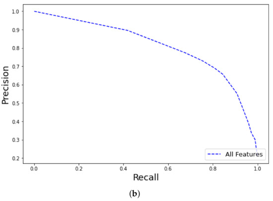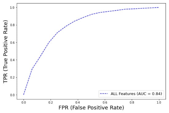 The performance of ML classification tasks is typically assessed by various well-known metrics, such as sensitivity (or recall), accuracy, specificity, F1 score, and area under the receiver operating characteristic curve (). The significance of the AUCs was measured using a significance level of [48]. The classification threshold was optimized for F1 score.
