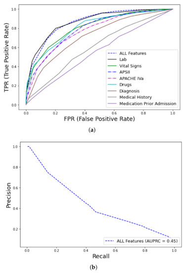 The best XGBoost classifier configuration (after hyper-parameter tuning) is with learning rate: 0.15, maximum tree depth: 12 gamma: 0.1, minimum sum of instance weight: 1, colsample_bytree: 0.7. Similarly to the AutoML framework, among the various feature groups, the model that achieved the best performance was the one trained with the dataset containing all features ( = 0.84, CI 0.83–0.85), as shown in Figure 9. The precision–recall curve AUC was 0.3 regarding early mortality in ICU patients with VTE from the eICU dataset, and this low score can be attributed to the extremely high imbalance class ratio. The detailed metrics of performance are shown in Table 6.
