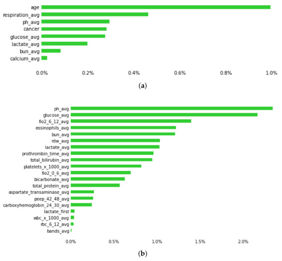 Plot showing predictive features of early mortality in ICU patients with thrombosis, using (a) and (b) datasets. Green bars represent the average percentage drop in predictive performance when the feature is removed from the model. (Abbreviations: avg, average; bun, blood urea nitrogen; fiO2: fraction of inspired oxygen; rdw, red cell distribution width; peep, positive end expiratory pressure; wbc, white blood cells; 0–6, 6–12, 24–30, 42–48 is the time in hours after admission).