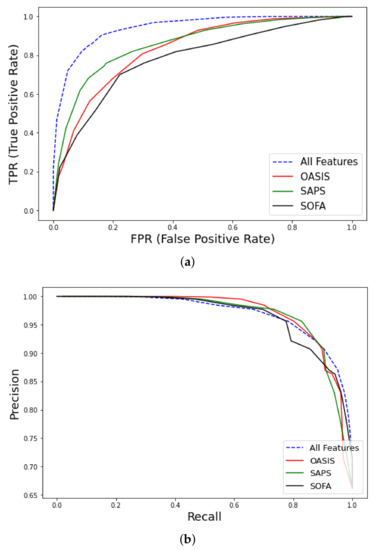 Prediction of early mortality in patients with thrombosis, using all clinico-laboratory features, achieved excellent performance ( = 0.93, CI 0.91–0.95), where CI denotes the confidence interval. The winning algorithm was random forest (RF), training 500 trees with the deviance splitting criterion and minimum leaf size = 3. Detailed information regarding metrics of performance and feature discriminative analysis can be found in [41]. As shown in Figure 2 and Appendix A Table A3, our model significantly outperformed nine well-known traditional medical scores, such as SAPS [17] and SOFA [19]. Specifically, among the various scores, the best performance was achieved by SAPSII ( = 0.85, CI 0.81–0.89), and when a combination of all available scores was used, the achieved performance was = 0.86, CI 0.81–0.88.