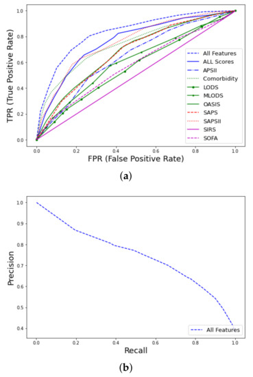 Receiver operating characteristic (ROC) curves for early mortality in ICU patients with thrombosis from MIMIC-III database using all features: (a) curves and comparison with traditional scores (APS, Acute Physiology Score; LODS, Logistic Organ Dysfunction Score; MLODS, Multiple Logistic Organ Dysfunction Score; OASIS, Outcome and Assessment Information Set; SAPS, Simplified Acute Physiology Score; SIRS, Systemic Inflammatory Response Syndrome; SOFA, Sequential Organ Failure), (b) Precision–recall (PR) curve.