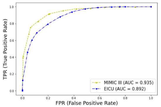 The eICU database contains information from APACHE version IV and IVa and Acute Physiology Score (APS) version III scores, whereas the MIMIC-III database contains SOFA, SAPS, Outcome and Assessment Information Set (OASIS), Logistic Organ Dysfunction Score (LODS), Multiple Organ Dysfunction (MODS), APS III, as well as comorbidity scores such as Elixhauser. We compared the performance () of the derived model using the extended feature set with the available medical scores recorded in the databases.