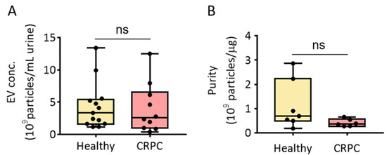 Isolation of urinary EVs via PEG precipitation from healthy donors and patients with CRPC. (A) Urinary EV concentration (EV particles/mL urine) from healthy donors and patients with CRPC. (B) Urinary EV purity (EV particles/μg protein) from healthy donors and patients with CRPC. All values are presented as the median ± SD (ns: no significance; n = 6–13).