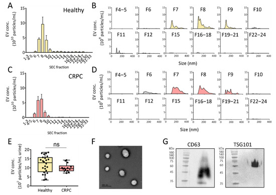 Isolation of urinary EVs via size-exclusion chromatography combined with UF from healthy donors and patients with CRPC. (A) Urinary EV concentration (EV particles/mL fraction) from healthy donors. (B) Urinary EV size distribution from healthy donors in all size-exclusion chromatography fractions. (C) Urinary EV concentration (EV particles/mL fraction) from patients with CRPC. (D) Urinary EV size distribution from patients with CRPC in all size-exclusion chromatography fractions. (E) Urinary EV concentration (EV particles/mL urine) from healthy donors and patients with CRPC. (F) TEM image of isolated urinary EVs. (G) Western blot analysis of the EV marker proteins. The number on the left of blot indicates the size marker. All values are presented as the median ± SD (ns: no significance; n = 3–24).