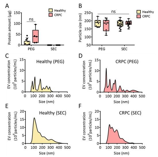 Comparative analysis of urinary EVs isolated via PEG precipitation and size-exclusion chromatography. (A) Protein amount (μg) from healthy donors and patients with CRPC. (B) Urinary EV particle size (nm) from healthy donors and patients with CRPC. (C,D) Urinary EV size distribution from healthy donors and patients with CRPC isolated via PEG precipitation. (E,F) Urinary EV size distribution from healthy donors and patients with CRPC isolated via size-exclusion chromatography combined with UF. All values are presented as the median ± SD (ns: no significance; n = 5–24).