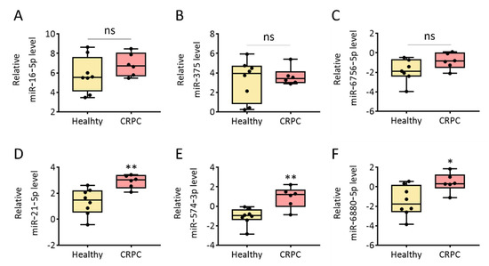Relative expression levels of cancer-related miRNAs in urinary EVs from healthy donors and patients with CRPC. (A) miR-16-5p, (B) miR-375, (C) miR-6756-5p, (D) miR-21-5p, (E) miR-574-3p, and (F) miR-6880-5p in urinary EVs from healthy donors and patients with CRPC analyzed using RT-PCR and normalized (ΔCT analysis) to expression levels for the U6 snRNA gene and are shown as log2 value. All values are presented as the median ± SD (* p < 0.05, ** p < 0.01, ns: no significance; n = 6–8).