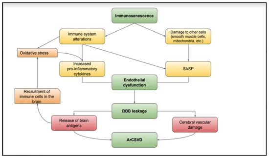Aging causes alterations in the innate and adaptive immune system that lead to increased oxidative stress and endothelial dysfunction; this results in an alteration of the blood–brain barrier and a release of brain antigens into the systemic circulation, leading to a recall of immune cells in the brain. The amplification of the immune response feeds the inflammatory damage, establishing a self-feeding circuit that generates and worsens ArCSVD.