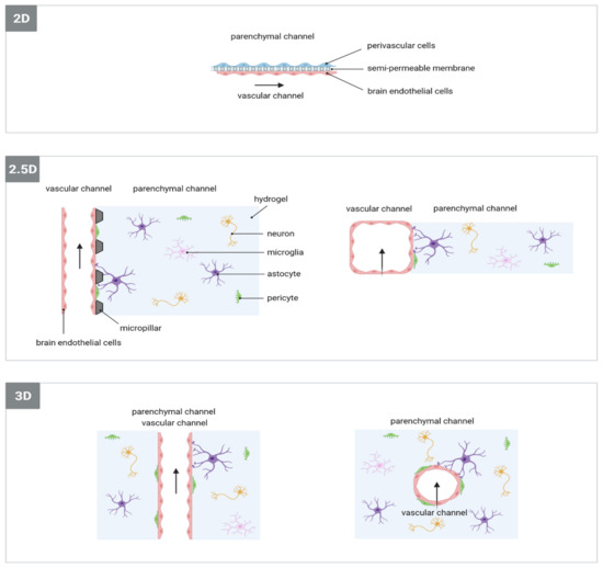 Schematic representation of 2D, 2.5D and 3D microfluidic-based BBB/NVU models. Perivascular cells indicated in 2D BBB/NVU model mainly consist of astrocytes and/or pericytes. The arrows indicate fluid flow. Figure based on Cameron et al. [186] and Katt et al. [192].