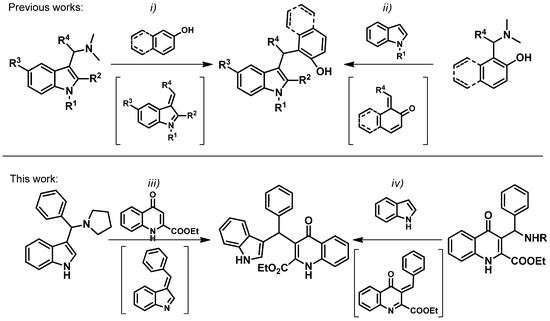 The work of Baruah et al. [42,43,44] includes both pathways of TRAM (3) synthesis starting either from indole-based Mannich products (Scheme 1, route i) or naphthol-/phenol-based Mannich products (route ii). Thus, the investigation of similar reaction routes is outlined for the ethyl ester of KYNA as well, starting from the Mannich base of indole (route iii) or the Mannich base of KYNA (route iv).