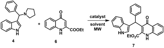With the starting material in our hands, in the first C–C bond-forming reactions, 4 was reacted with the ethyl ester of KYNA (6) in MeCN at 100 °C (under MW conditions) with thiourea as the catalyst, based on the work of Baruah et al. [42] (Scheme 3). The conversion determined by NMR spectrometry was low; thus, the best conditions used for the alternative reaction route [43] were investigated, showing promising results (Table 1). Fortunately, the still low yield of 7 could be further improved by raising the reaction temperature to 160 °C. However, any further increase caused a decomposition of the starting materials.