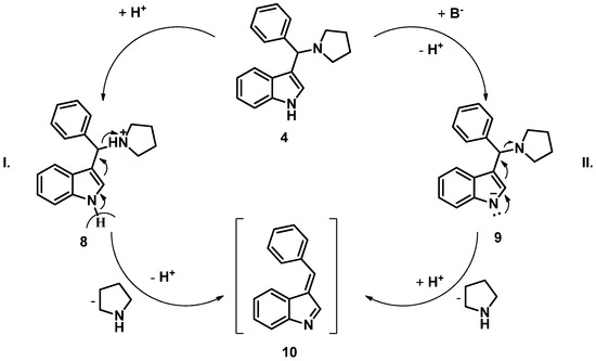 The use of a catalyst was crucial, as the desired TRAM did not form without the use of a base or an acid catalyst. It is interesting to mention that although acid catalysis resulted in somewhat higher conversion, both acid and base catalysis could enhance the synthesis of 7. Baruah et al. hypothesized that the reaction taking place between the indole derivative and varied electron-rich aromatic structures involves the formation of intermediate 10 [42,43]. In their proposed elimination–addition pathway starting from a Mannich base of indole, thiourea activates the amine moiety of the aminoalkyl function through double hydrogen bonding and converts it into a better leaving group (Scheme 4, I). Concerning triethylamine (TEA) used in our reactions, a hydrogen bond is unable to form; therefore, a more direct form of catalysis is proposed. Through the application of high temperature and TEA, the deprotonation of the indole moiety takes place followed by a subsequent rearrangement of the indole anion into benzylidene intermediate 10. Then, the latter is attacked by a molecule of the electron-rich KYNA yielding compound 7. It is also surmised that the C–N bond cleavage of the indole derivative could also take place through the elimination of pyrrolidine via the protonation of the amine moiety, making it a better leaving group and leading to intermediate 10 (Scheme 4, II).