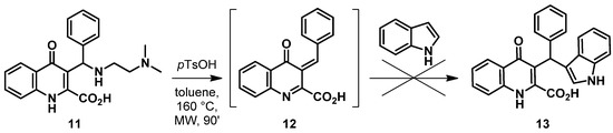 After successfully optimizing the reaction through route (iii), the synthesis of 7 was planned through the reaction of the KYNA Mannich base with indole (Scheme 1, route iv). KYNA Mannich derivatives synthesized previously are abundant [41]; however, compounds containing the crucial phenol structure were narrowed down only to a single compound (11, Scheme 5). Unfortunately, using this derivative in the reaction under conditions optimized previously did not result in the desired compound.