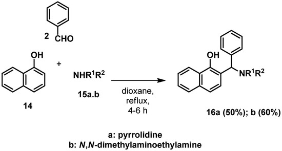 It is presumed that this may be due to the N,N-dimethylaminoethyl moiety being a bad leaving group. In order to fully support this hypothesis, a synthetic procedure was applied. Unfortunately, a Mannich base of KYNA containing a secondary amine function could not be synthesized, which is probably due to steric hindrance. Thus, considering the similarity of 1-naphthol to KYNA [41], the synthesis of Mannich bases 16a and 16b was carried out, as shown in Scheme 6.