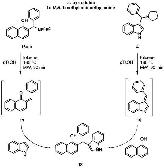 A comparison of the reaction of 1-naphthol with 6 and the reactions of 16a and 16b with indole (Scheme 7) allows us to arrive at two conclusions: (a) Mannich bases containing secondary amines (e.g., 11 and 16b) are less prone to undergo the transformation because of a bad leaving group character; (b) reactions through intermediate 10 are more preferable compared to reactions via possible ortho-quinone methide intermediates 12 and 17 derived either from 11 or from the Mannich bases of 1-naphthol (16a,b). This may be due to a possible hydrogen bridge between the hydroxy/oxo group in 16a,b and 11 in addition to the amine moiety, making the protonated form a more stable intermediate.