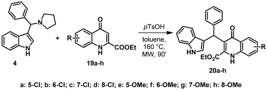 - 4-Oxo-1,4-dihydroquinoline-2-carboxylic acid ethyl ester (6) or its derivatives (19a–h, 0.1 mmol) and 4 (0.15 mmol) were placed in a pressure-resistant 10 mL vessel with toluene (5 mL). The mixture was kept at 160 °C for 3 h in a CEM Discover SP microwave reactor (300 W). Work-up is similar to method B) but lower conversions and yields have been achieved with method A).