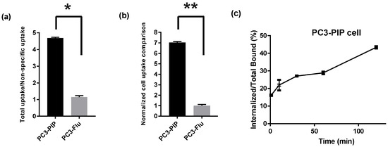 The PSMA-specific uptake of [18F]F-TZ(PSMA)-LEGU-TLR7 was determined by two methods. As shown in Figure 2a, the PSMA-specific uptake of [18F]F-TZ(PSMA)-LEGU-TLR7 was measured in PSMA+ PC3-PIP vs. PSMA− PC3-Flu. The specific vs. nonspecific uptake ratio of [18F]F-TZ(PSMA)-LEGU-TLR7 was ~4.5. The other method used the PSMA-binding blockade of 1 mM of Lys-Urea-Glu, resulting in a 7-fold reduction of PSMA-binding. In other words, the PSMA specific uptake of [18F]F-TZ(PSMA)-LEGU-TLR7 was ~7 times higher in PC3-PIP than PC3-Flu cells (Figure 2b). Furthermore, we observed a time-dependent PSMA-mediated internalization of [18F]F-TZ(PSMA)-LEGU-TLR7 (Figure 2c), demonstrating that the drug payload can be intracellularly delivered to reach the action target by our T-SMPDC platform.