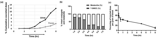 Without incorporating an albumin-binding moiety [52], the relatively slow in vivo clearance and tissue-distribution profiles of the T-SMPDCs could be advantageous for the therapeutic applications of the prodrug conjugates because the prolonged high plasma concentration facilitates the targeted accumulation and unidirectional internalization to reach the intended intracellular target protein.