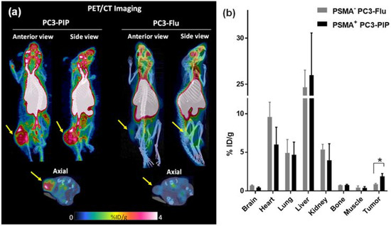 The in vivo PET/CT imaging evaluation of [18F]F-TZ(PSMA)-LEGU-TLR7 was performed in severe combined immunodeficiency (SCID) mice subcutaneously bearing PSMA+ PC3-PIP and PSMA− PC3-Flu xenografts. At 1 h p.i. of [18F]F-TZ(PSMA)-LEGU-TLR7, the PET imaging data was acquired for 15 min followed by a CT scan to obtain the anatomical information. Shown in Figure 4a are representative PET/CT images (1 h p.i.) presented in the format of maximum intensity projections (MIP). Clearly, the PSMA+ PC3-PIP tumors were visualized by PET imaging with [18F]F-TZ(PSMA)-LEGU-TLR7 but not the PSMA− ones, indicative of the expected uptake specificity. Indeed, quantitative imaging data analysis (Figure 4b) showed that the percentage of injected dose per gram (%ID/g) of [18F]F-TZ(PSMA)-LEGU-TLR7 was significantly higher in PSMA+ PC3-PIP (1.9 ± 0.4% ID/g) than in PSMA− PC3-Flu (0.8 ± 0.3% ID/g) tumors (p = 0.02). In addition, [18F]F-TZ(PSMA)-LEGU-TLR7 was observed with less uptake in the kidneys (3.96 ± 2.1% ID/g) than our previously reported first generation T-SMDC, 68Ga-NO3A-DM1-Lys-Urea-Glu (7.33 ± 2.25% ID/g) [29], but with higher accumulation in the heart (6.0 ± 2.2% ID/g), lung (4.7 ± 1.6% ID/g), and liver (25.9 ± 4.6% ID/g). This likely reflects the more lipophilic nature of [18F]F-TZ(PSMA)-LEGU-TLR7, which can be attributed to the presence of lipophilic GARD and other aromatic functionalities in the T-SMPDCs (Scheme 1).