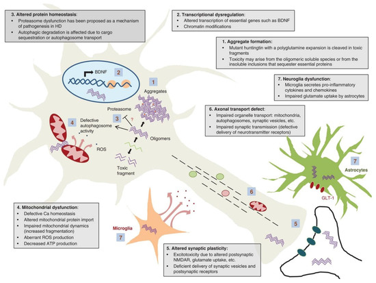 This section aims to provide concise background on HD pathogenesis rather than to give a detailed review, which is provided elsewhere [1,5,6,36,37,38]. Due to the immense complexity of its pathogenesis, implications of HD within striatal neurons are still under investigation; however, there are currently seven proposed mechanisms of pathogenesis, as depicted in Figure 1.