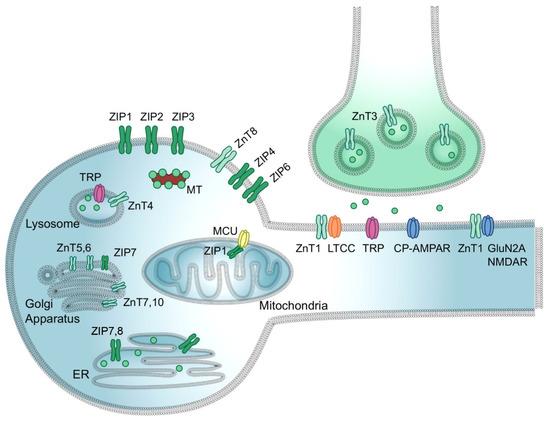Zinc transport in neurons. Zn2+ is loaded into presynaptic vesicles via ZnT3, released into the synaptic cleft, and conducted to the cytosol of a postsynaptic neuron via L-type calcium channels (LTCC), transient receptor potential channels (TRP), NMDA receptors, and calcium-permeable AMPA receptor (CP-AMPAR). Within the neuron, Zn2+ uptake to/release from specific organelles is mediated by organelle-specific ZIPs and ZnTs. Zn2+ import into mitochondrial matrix is mediated by mitochondrial Ca2+/cation uniporter (MCU) coupled with ZIP1. Free Zn2+ concertation within the cytosol is buffered by metallothioneins (MT). The figure was adapted from Krall et al. [86] and replicated with permission from Elsevier Ltd., license #5203200109216, obtained on 6 December 2021.
