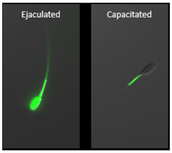 Zinc localization in boar ejaculated and capacitated spermatozoa using fluorescent probe FluoZinTM-3, AM. Capacitation-related efflux of zinc ions from the sperm head and principal piece is a prerequisite for achieving capacitated, hyperactivated status. Following capacitation, zinc is localized exclusively within the mitochondrial sheath where it is functional, thus indicative of the importance of zinc homeostasis in the sperm mitochondria. The scale bar represents 10 µm.