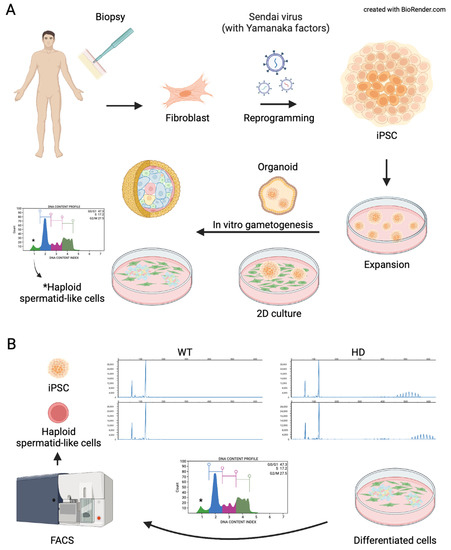 Schematic representation of current models of in vitro spermatogenesis. (A) somatic cells can be collected from a patient where they can be reprogramed with reprogramming factors to derive induced pluripotent stem cells (iPSCs). The iPSCs can be preserved, expanded, and induced to produce advanced spermatogenic cells via 2D culture methods or 3D culture methods (3D). (B) A schematic representation of a recent study where differentiated spermatogenic cells were used to study developmental mechanisms involved in the pathogenesis of Huntington’s disease. BioRender.com, access on 20 April 2022.