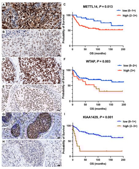 Representative histology sections show high (A,D,G) and low (B,E,H) expression levels of METTL14, WTAP, and KIAA1429 visualized by immunohistochemistry; hematoxylin (blue) was used for nuclear staining (bright field image, 400× magnification). Kaplan–Meier estimates show a significantly shorter overall survival (p < 0.05) in patients with high expression of (C) METTL14, (F) WTAP, and (I) KIAA1429. Scale bar = 20 µm.