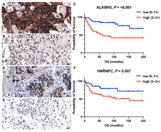 Representative histology sections show high (A,D) and low (B,E) expression levels of ALKBH5 and HNRNPC visualized by immunohistochemistry; hematoxylin (blue) was used for nuclear staining (bright field image, 400× magnification). Kaplan–Meier estimates show a significantly shorter overall survival (p < 0.05) in patients with high expression of (C) ALKBH5 and (F) HNRNPC. Scale bar = 20 µm.