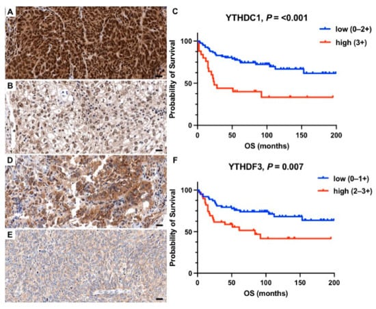 Representative histology sections show high (A,D) and low (B,E) expression levels of YTHDC1 and YTHDF3 visualized by immunohistochemistry; hematoxylin (blue) was used for nuclear staining (bright field image, 400× magnification). Kaplan–Meier estimates show a significantly shorter overall survival (p < 0.05) in patients with high expression of (C) YTHDC1 and (F) YTHDF3. Scale bar = 20 µm.