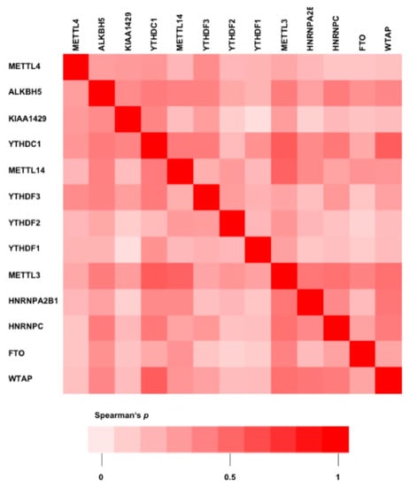 Correlation heatmap visualizing Spearman’s p correlation coefficients of m6A protein expression in the UHB CC cohort.