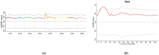 The calculation of Δ(SNP-index) values on the chromosome to identify the candidate regions associated with male sterility in alfalfa based on BSA-seq. (a). Candidate regions were located by the association analysis of specific SNPs between T03 and T04. (b). The specific candidate region on chromosome 5.