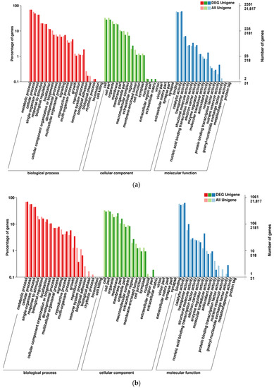 GO enrichment of DEGs in two compared groups. (a). T01-vs.-T02 compared group. (b). T04-vs.-T03 compared group.
