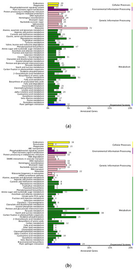 The GO annotation of DEGs in two set pairs showed that all genes were assigned to three major GO terms, where a big proportion of DEGs were identified in biological processes and enriched in 20 subclusters (Figure 4). For KEGG annotation, a total of 1469 DEGs were assigned to 115 KEGG pathways in parent bulk group (T01-vs.-T02), and the Ribosome, Carbon metabolism, Starch and sucrose metabolism, Phenylpropanoid metabolism and Biosynthesis of amino acids were the top five most enriched pathways (Figure 5a). For T03 and T04 bulks, the 537 DEGs were assigned to 91 KEGG pathways and the Starch and sucrose metabolism was the most significantly enriched pathway (Figure 5b). In addition, the pathway of Pentose and glucuronate interconversions, Ribosome, Phenylpropanoid metabolism and plant hormone signal transduction was also significantly enriched by large DGEs. These results indicated that the sterile development may be associated with various metabolic and biological process.