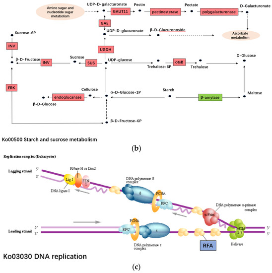 The pathways of DEGs’ participation. (a). The pathway of plant hormone signal transduction (ko04075). (b). The pathway of starch and sucrose metabolism (ko00500). (c). The pathway of DNA replication (ko03030).