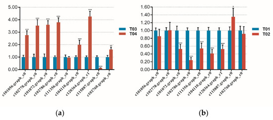 The relative mRNA expression of 9 DEGs quantified by qRT-PCR(One-way ANOVA was performed by SPSS Ststistics 17. ***, p < 0.01; **, p < 0.05; *, p < 0.1). (a) the relative mRNA expression of 9 DEGs in bulk T03 and T04. (b) the relative mRNA expression of 9 DEGs in bulk T01 and T02.