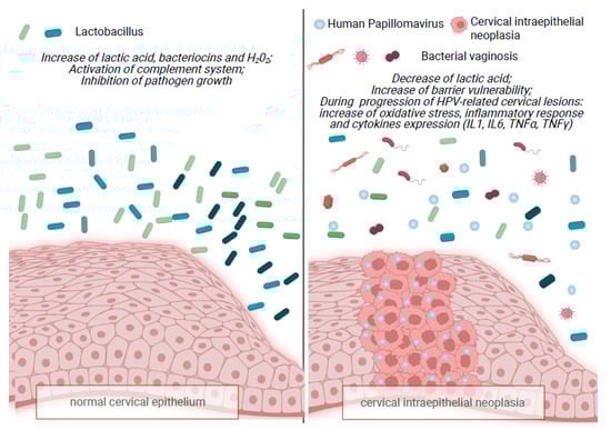 In VMB there is a complex balance between microorganisms. Lactobacillus competes with pathogens, and inhibits their growth by secreting lactic acid, bacteriocins, and H2O2 and, furthermore, by activating the complement system, triggering a local immune response. As mentioned earlier, when pathogens colonize the vaginal epithelium, this leads to a waterfall effect with an elevated pH and the adhesion of pathogens, such as HPV, to the epithelium, causing disruption and the activation of a host immune response with chronic genital inflammation.