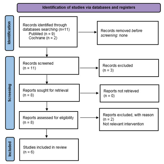 In order to perform a literature review, we followed the preferred reporting items for systematic reviews and meta-analyses (PRISMA) guidelines [59]. The medical literature on the role of vaginal microbiota in cervical intraepithelial neoplasia available between November 2015 and September 2021 was reviewed, screening the Medical Literature Analysis and Retrieval System Online (PubMed/MEDLINE) and the Cochrane Central Register of Controlled Trials (CENTRAL). The search strategy used in both databases included the combination of key words and MeSH terms “microbiota” AND “cervical intraepithelial neoplasia” OR “cervical dysplasia”. From 11 records screened, 6 were recognized as eligible for this review. Details are provided in Figure 2.