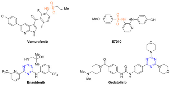 Undoubtedly, compounds containing a sulfonamide moiety belong to a wide group of chemotherapeutic agents that have been used as anticancer agents. One good example can be Vemurafenib, which has been used since 2011 in the chemotherapy of melanomas with the BRAF V600 mutation [9]. Vemurafenib is currently in phase two clinical trials for colorectal cancer patients with the BRAF mutation in the VIC regimen [10] and for non-small cell lung cancer [11]. Another sulfonamide compound, E7010 (Figure 1), is presently in phase two clinical trials in colorectal cancer patients [12]. In turn, Enasidenib, approved by the FDA in 2017 [13], containing the 1,3,5-triazine moiety, is used in relapsed or refractory acute myeloid leukemia (AML), and Gedatolisib (Figure 1) is used in combination either with Talazoparib, at present in phase two clinical trials for breast cancer [14], or Palbociclib, in phase one clinical trials for patients with head and neck, pancreatic, lung and solid tumors [15].