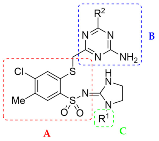 Our previous reports indicated that 4-chloro-2-arylmethylthio-5-methylbenzenesulfonamide derivatives show cytotoxic activity against numerous human cancer cell lines, including colon, breast and cervical cancer, among others [16,17,18,19]. We have also proved that some of these compounds showed an apoptotic effect in cancer cells. In this work, we developed a series of 2-[(4-amino-6-R2-1,3,5-triazin-2-yl)methylthio]-N-(1-R1-imidazolidin-2-ylidene)-4-chloro-5-methylbenzenesulfonamides (Figure 2), applying the molecular hybrids strategy. Molecular hybrids were designed as a combination of 2-mercaptobenzenesulfonamide fragments (A) with a 4-amino-6-R2-1,3,5-triazin-2-yl ring (B). The structures of the designed compounds were also diversified with the substituent R1 (C) (Figure 2) on the imidazolidine ring in position N-1 to investigate their influence on cytotoxic activity.