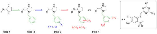 The quantitative structure–activity relationship (QSAR) computational method is helpful in the design and development of new anticancer active compounds [20,21,22]. Thus, a series of 2-[(4-amino-6-R2-1,3,5-triazin-2-yl)methylthio]-N-(1-R1-imidazolidin-2-ylidene)-4-chloro-5-methylbenzenesulfonamide derivatives (20–157) were synthesized in four separate steps, which required the building of QSAR models and introducing structural modifications, leading to better cytotoxic activities (Figure 3). All synthesized compounds were tested in a series designed sequentially for their cytotoxic activity against three human cancer cell lines, i.e., HCT-116, MCF-7, and HeLa. The resulting experimental data for the HCT-116 cell lines were consequently used for QSAR analysis. QSAR models were constructed step by step for a series of structurally modified compounds with R1 = H (Step 1), Bn (Step 2), and 4-F-Bn (Step 3). The predictive performance of the models built for the compounds from Step 3 allowed for the virtual design of a subsequent series modified in the N-1 position of imidazolidine ring with R1 = 3-F3C-Bn, 4-F3C-Bn, and 3,5-bis(F3C)Bn (Step 4).