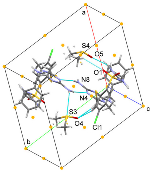 Crystal packing and hydrogen bonding in 27. Molecules of the main component are linked by the ring-type hydrogen bond motif NH…N (using N4 and N8 atoms) located at the inversion center (drawn as the orange ball). The two dimethylsulfoxide molecules are interacting with the sulfonamide through NH…O, CH…O or NH…S hydrogen bonds.